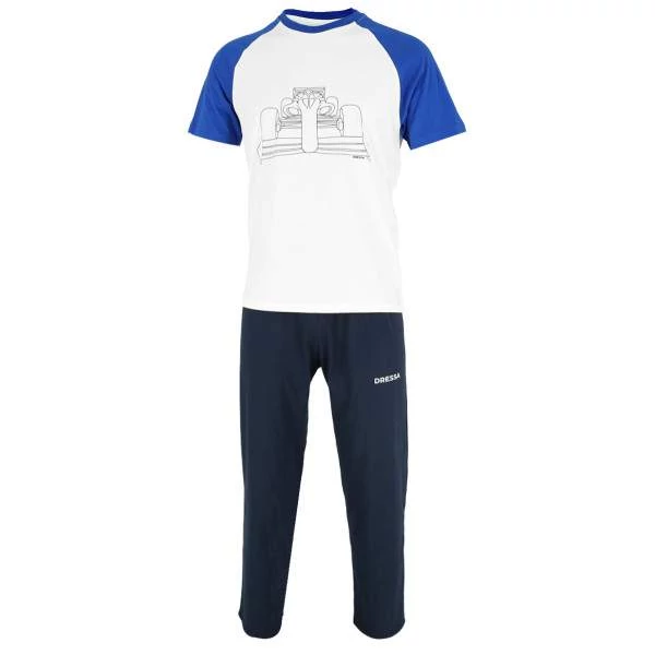 Dressa Home versenyautó mintás rövid ujjú férfi pamut pizsama - fehér színben kényelmességet és puhaságot garantál. Két részes rövid ujjú pizsama, a felső része mintás, az alsó része hosszú szárú, sötétkék színben pompázik ami még varázslatosabbá teszi ezt a pihe-puha modellt.