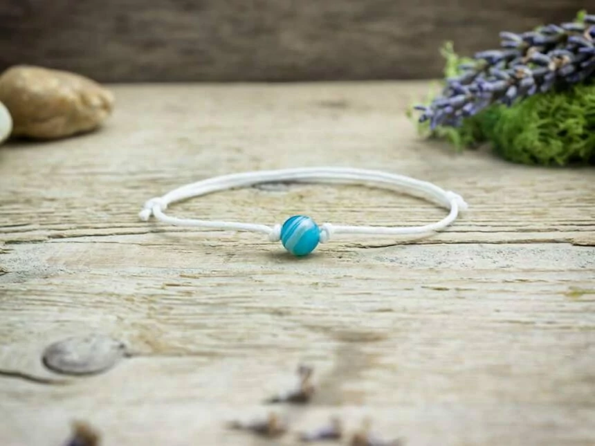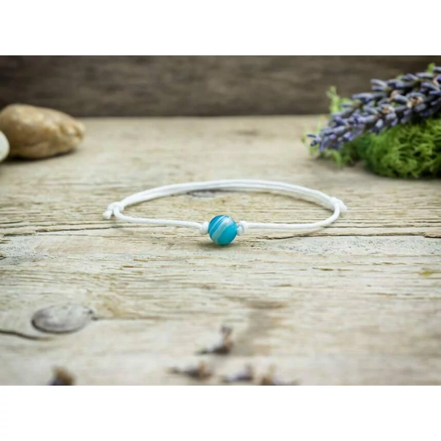 apró fehér színű karkötő csúszócsomóval, így állítható a mérete. A karkötő egy kék színű achát gyönggyel van díszítve.