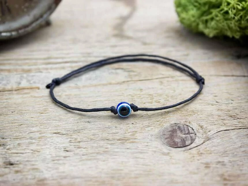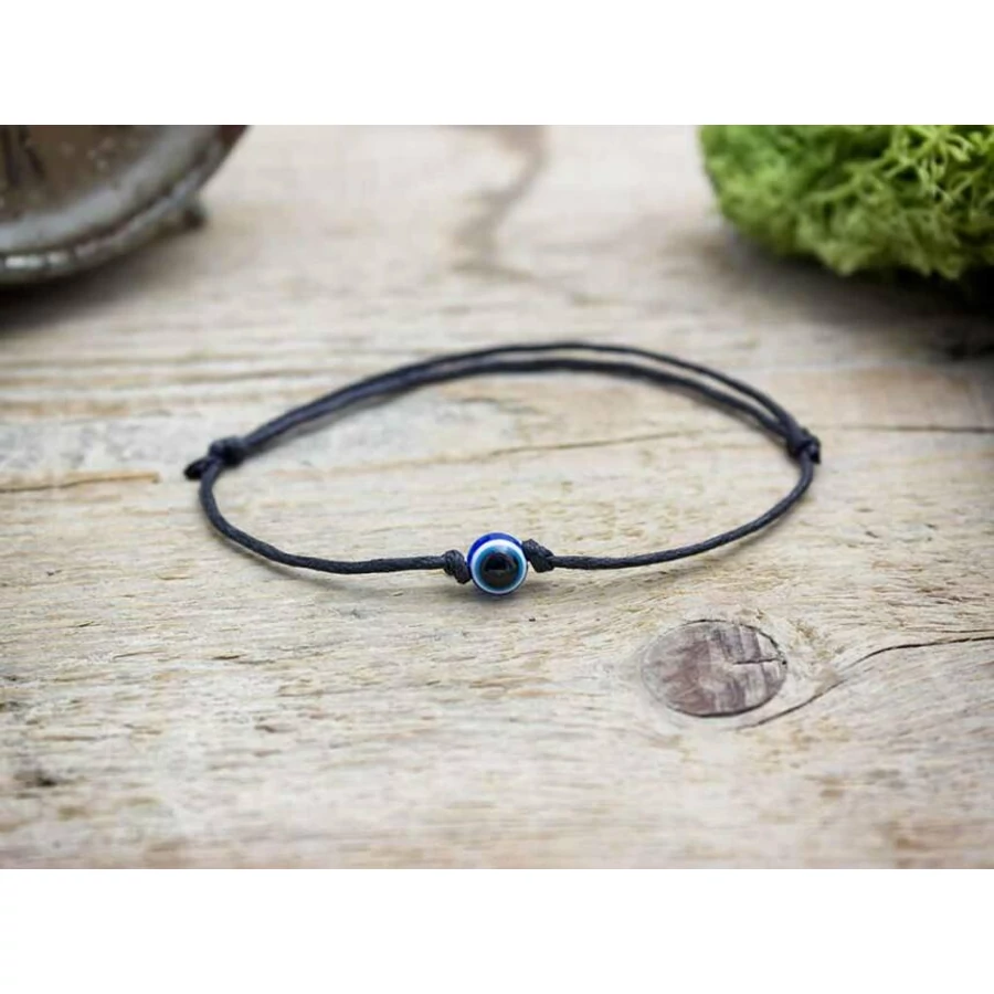 Fekete színű karkötő kék amulett gyönggyel. A karkötő 15,5 és 24 cm között állítható csúszócsomókkal. A karkötő története: Sötétkék alapon egy világoskék szemet kell elképzelni, ami kerek. Ez a kék szem a görögök - és más mediterrán népek, arabok, törökök - hite szerint a szemmel verés, az ártó pillantások ellen véd. A görög meggyőződés alapján, az ún. "evil eye" (ματι), a gonosz szem egy olyan negatív erő, amely többé-kevésbé mindenkiben jelen van, de főleg a szőke, kék szemű emberek bírnak vele. Akár tudattalanul is kárt tehetünk ezzel az erővel, elég, ha túl sokáig nézünk, bámulunk valakire vagy valamire (tárgyakra is hatással lehet) – különösen, ha ezt irigykedve tesszük. Ezért van az, hogy bár a görög szülők nagyon büszkék a gyermekeikre, azt nem szeretik, ha megbámuljuk őket, mert a rossz pillantástól a gyerek "megboszorkányosodhat vagy kivívhatja az istenek irigységét". Biztos, ami biztos, az evil eye kivédésére a görögök kék szemet mintázó amuletteket hordanak a nyakukban, és a csuklójukon.