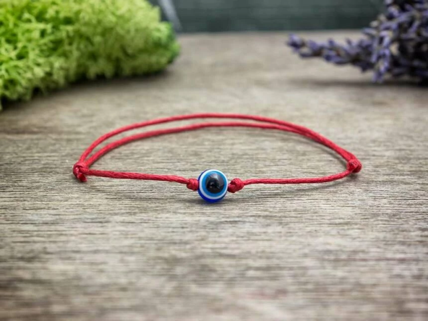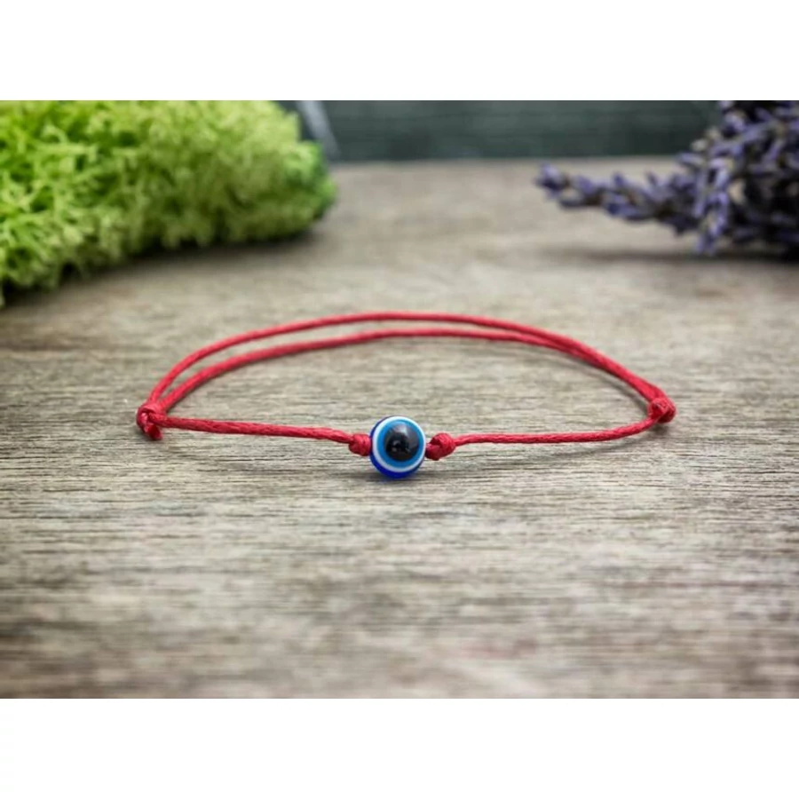 Vörös színű karkötő kék amulett gyönggyel. A karkötő 15,5 és 24 cm között állítható csúszócsomókkal. A karkötő története: Sötétkék alapon egy világoskék szemet kell elképzelni, ami kerek. Ez a kék szem a görögök - és más mediterrán népek, arabok, törökök - hite szerint a szemmel verés, az ártó pillantások ellen véd. A görög meggyőződés alapján, az ún. "evil eye" (ματι), a gonosz szem egy olyan negatív erő, amely többé-kevésbé mindenkiben jelen van, de főleg a szőke, kék szemű emberek bírnak vele. Akár tudattalanul is kárt tehetünk ezzel az erővel, elég, ha túl sokáig nézünk, bámulunk valakire vagy valamire (tárgyakra is hatással lehet) – különösen, ha ezt irigykedve tesszük. Ezért van az, hogy bár a görög szülők nagyon büszkék a gyermekeikre, azt nem szeretik, ha megbámuljuk őket, mert a rossz pillantástól a gyerek "megboszorkányosodhat vagy kivívhatja az istenek irigységét". Biztos, ami biztos, az evil eye kivédésére a görögök kék szemet mintázó amuletteket hordanak a nyakukban, és a csuklójukon.