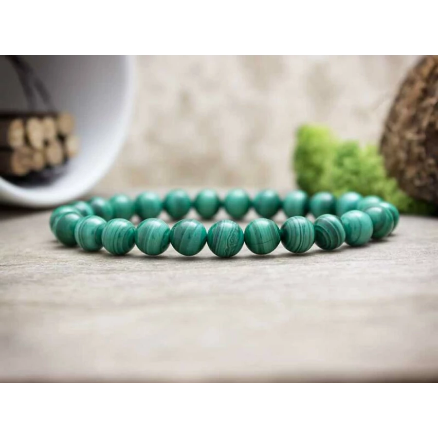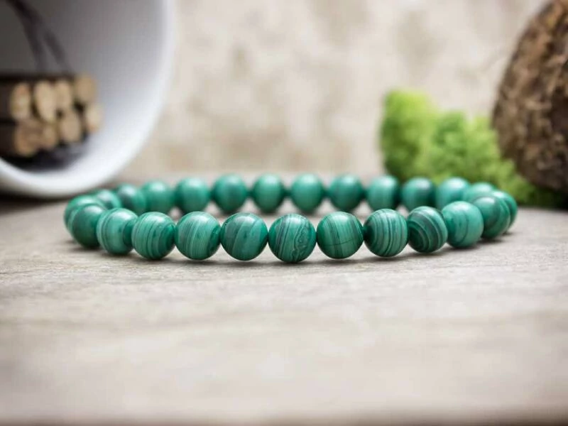 Az ásvány golyók gumira vannak felfűzve.\n\n\n\n Amit a malachitról érdemes tudnod:\n\n A malachit a karbonát ásványok közé tartozó réztartalmú ásvány. Rendszerint rostos, szálas vagy vesés, fürtös megjelenésű, néha fenn-nőtt vékony tűs kristályokban is megtalálható.\n\n\n\n Lelki gyógyhatás:\n\n Elvezet, megmutatja mi az az önutáló gondolatminta, ami már bennem a fizikai betegséget okozza. Gyengéd szeretetével megtalálja a megoldást velem, egmutatja, hogyan kezdjem, mi a teendő, és segít elkezdenem. Erőt ad bátorítást. Segít kibomolni bennem a kreativitást. Kitágítani a horizontot. Bátorságot, erőt ad a megvalósításhoz. Megtanít szeretni önmagam, ráébreszt arra, ki vagyok én! \n\n\n\n Testi gyógyhatás:\n\n Görcsoldó. Szülőkőnek is nevezik, mert nagy segítséget nyújt a szülési fájdalmak enyhítésében. Együtt rezeg a női ivarszervvel, így minden nő probléma orvoslója. Csökkenti a vérnyomást. Gyógyítja: asztma, csonttörés, szédülés, látóideg, lép, pajzsmirigy. Összehangolja a DNS-t. Erősíti az immunrendszert. Erősíti a májat. Derékon hordva segít a cukorbetegeknek\n\n\n\n Csillagjegyei: Bika, Mérleg, Skorpió, Bak, Vízöntő \n\n\n\n Csakrái: minden csakrába kapcsolódik\n\n\n\n Nikkelmentes ékszer.\n\n Egyedi tervezés alapján készült kézműves ékszer.\n\n Amennyiben egyéni kérésed van, vagy nem találod, amit szeretnél, keress engem bátran.\n \n\n \n\nFigyelem! Az ásványokat, kristályokat az őskor óta használják a test, a lélek és az érzelmek harmonizálására. Az ókori kultúrákban kifejezetten elterjedtek voltak. Az évezredek alatt számtalan tudás és tapasztalat gyűlt össze róluk. Ásvány ékszereink leírásánál a meghatározó szakirodalom alapján készült összegzések olvashatók. Fontos! Az ásvány ékszerek viselése, az ásványok és kristályok gyógyításban, alternatív terápiaként való használata nem helyettesíti a modern orvostudományt, a gyógyszeres kezelést. Betegség esetén az öngyógyítás helyett kérjük, forduljon szakemberhez!\n