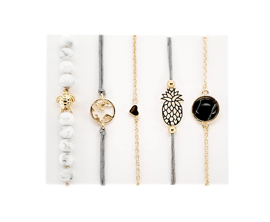 OCEANSIDE SZÜRKE ANANÁSZOS női karkötő aszett tartalma öt darab karkötő, figyelmet felkeltő díszítő elemekkel, melyekkel a strandok királynője lehetsz. Két darab aranyszínű, két darab osztrigaszürke zsinóros és egy darab a tengerparti sziklára emlékeztető színvilágú gyöngyös karláncot tartalmaz. Találni rajtuk divatos motívumokat, amelyek odavonzzák az érdeklődők tekintetét. Hossza: 18.5-22.5 cm Színe: osztrigaszürke, gránit, szikla, arany Anyaga: zsinór, ötvözet, gyöngy