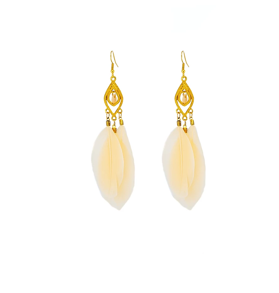 RAVENNA toll fülbevaló dupla gyémánt alakkal díszített, belsejében gyönggyel ékített nápolyi sárga toll fülbevaló. Nyári fesztiválokra, esküvőkre és partykra ajánlott függő. Könnyedén a fülbe akasztható horogzárral, a nyári kánikulában is kellemes viselet. Hossza: 12 cm Színe: arany, nápolyi sárga Anyaga: ötvözet, toll