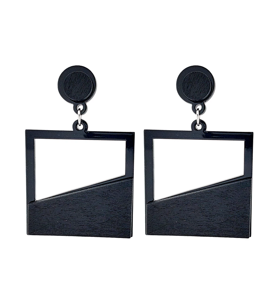 RIGA női geometrikus fülbevaló abszolút a geometrikus formavilágot képviseli ez a négyzet alakú fa fülbevaló Fekete színe mindig alkalmas ugyanúgy, mint az a bizonyos kicsi fekete koktélruha. Hossza: 6.5 cm Színe: fekete Anyaga: ötvözet, fa