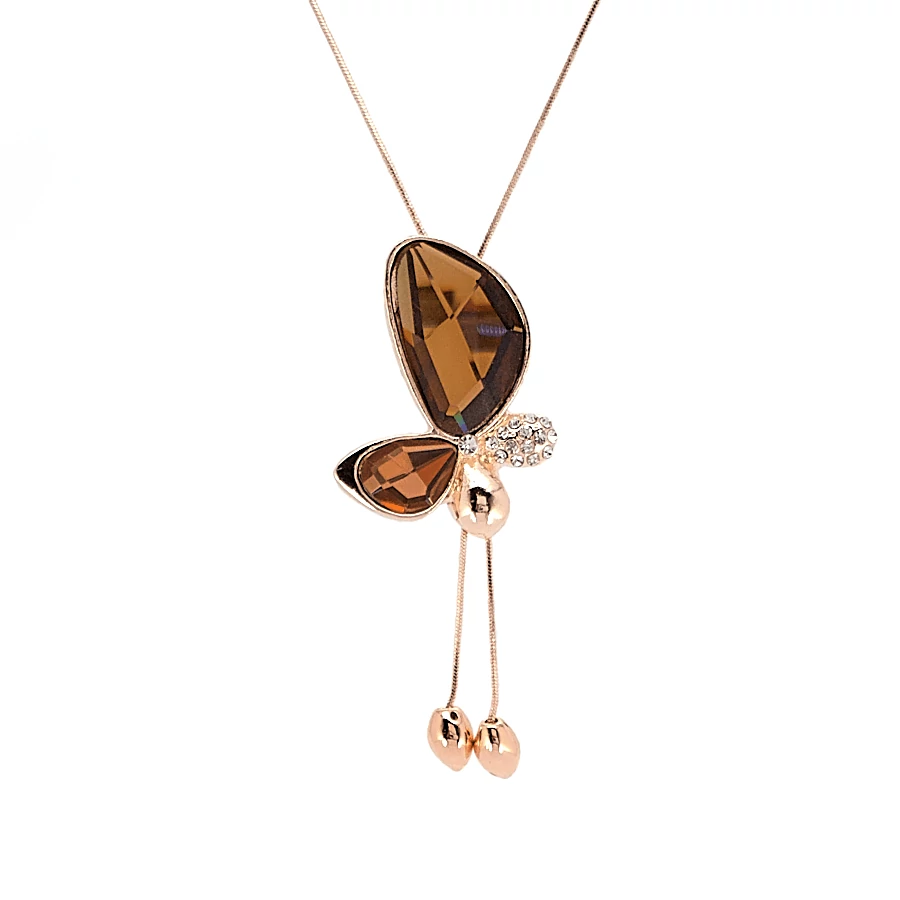 ROBERTA női ékköves nyaklánc nagyon szép, egyedi formatervezésű nyaklánc. Cirkónia kristály berakással díszített, bronzbarna színű csiszolt üveg díszíti a rózsaarany színű hosszú láncos nyakéket. Medál mérete: 4,5 x 3,5 cm Hossza: 88 cm Színe: áttetsző kristály, rózsaarany, bronzbarna Anyaga: ötvözet, cirkónia, üveg