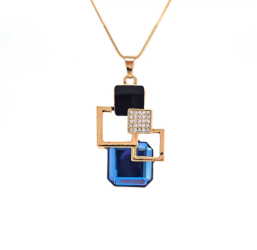 ROME arany női ékköves nyaklánc hosszú láncos, nagy medálos nyaklánc. Geometrikus formatervezésű nagy medál jellemzi, melyet cirkónia kristály berakás, ébenfekete és áttetsző csiszolt üveg díszít. Medál mérete: 5,7-3,5 cm Hossza: 75 cm Színe: áttetsző kristály, rózsaarany, ánizskék, ébenfekete Anyaga: ötvözet, cirkónia, üveg