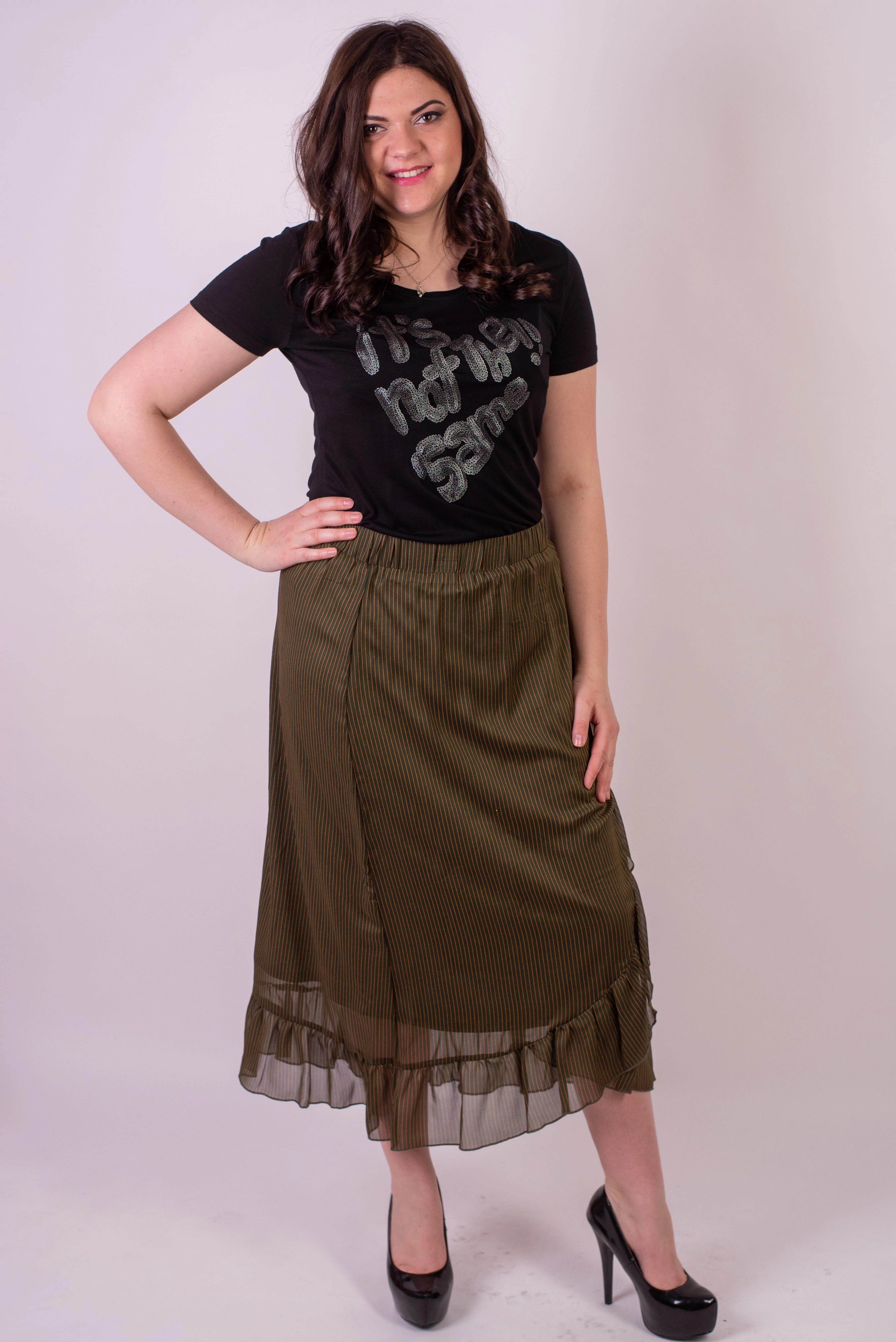 SISTERS POINT női szoknya, kellemes méregzöld csíkos színvilággal, GINA-9 modell, kellemes lágy esésű alsószoknyás darab, alsó szegélye fodorban végződik, derék része gumírozott