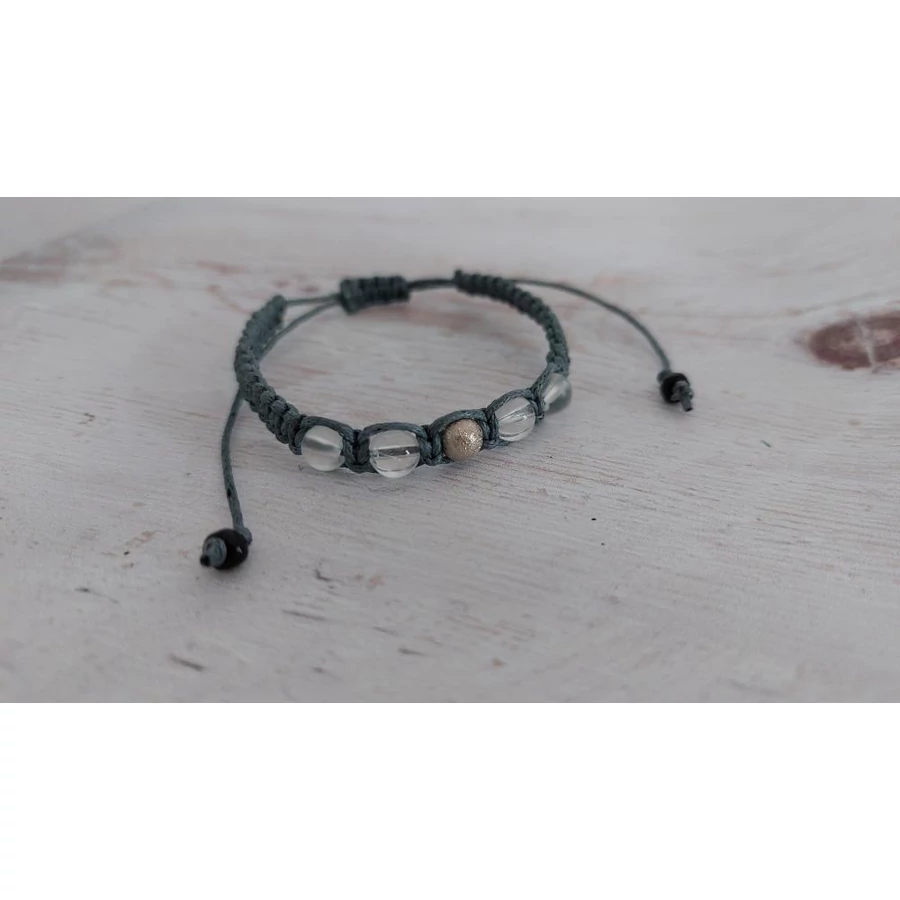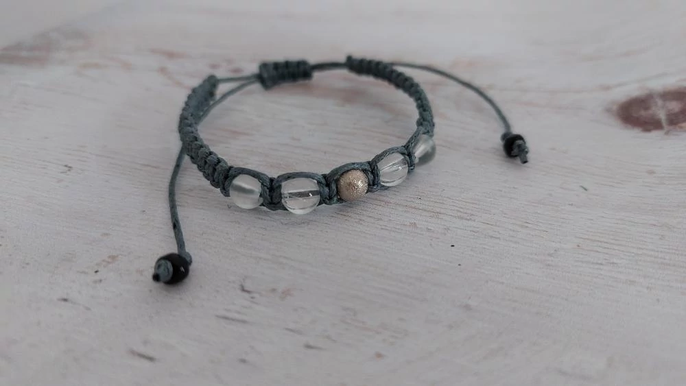 Szürke makramé karkötő hegyikristály és acél gyöngyökkel